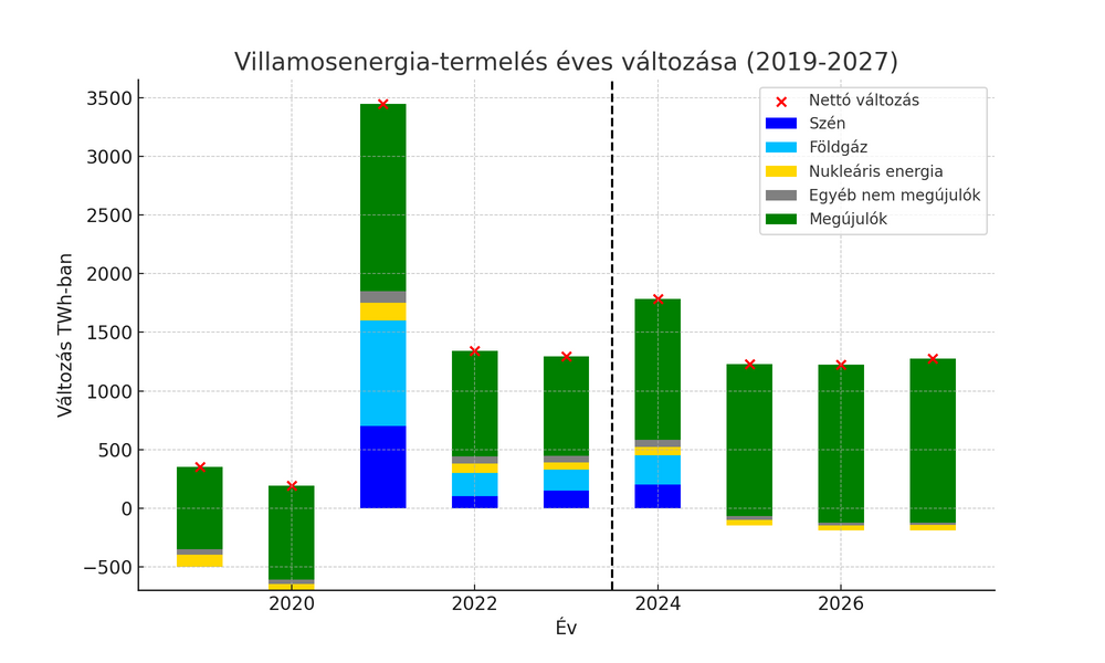 - Kína várhatóan kulcsszerepet játszik ebben a növekedésben, hiszen 2024-ben az ország áramfogyasztása 7%-kal nőtt, és ez az ütem 2027-ig évente 6% körül marad.